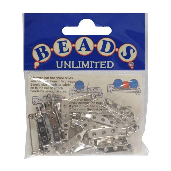 The brooch bar findings measure 25mm, though the Beads Unlimited range includes other sizes. There are 18 included in the pack. These feature a three-hole plate for gluing, resining or sewing to fix your brooch attachment.