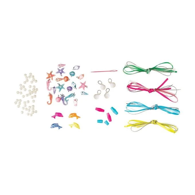 With the embellishments and materials included, kids can make necklaces and bracelets with colourful sea-themed beads, like dolphins, starfish, sea horses, shells and pearl beads. Add delicate ribbon and super-safe snap-off closures for everyday wear.