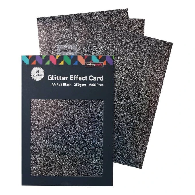 Bring stunning shimmer to every papercraft design using this Black Glitter Effect Card! The sparkling finish is perfect for embellishing cards, gift tags, scrapbook pages and other arts and crafts.