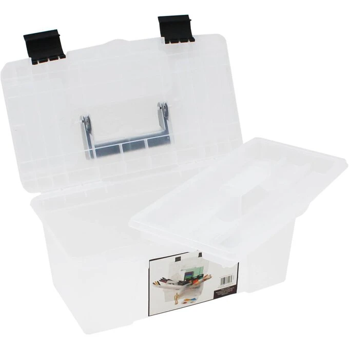 Keep your crafting collection organised โ ready for your next project! The Clear Universal Craft Box is the answer. A plastic storage box, this is ideal for crafting at home or on the move, with plenty of room inside for your materials and a handle attached for comfortable carrying.