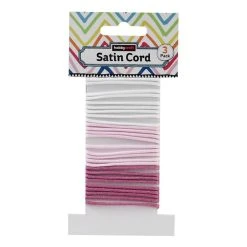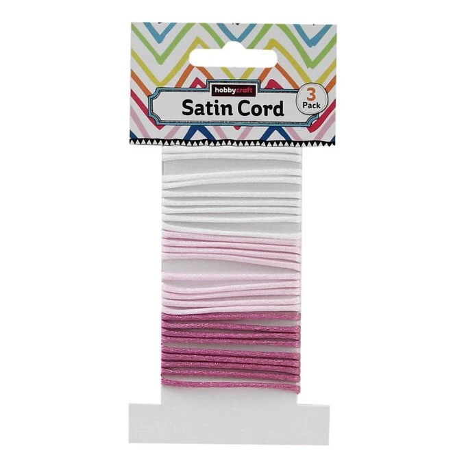 There are three 1m satin cords in three colours: white, baby pink and metallic pink. Cut each one to the length you require and design unique bracelets for yourself and friends. The satin cord gives a smooth, strong cord that will hold your embellishments well.