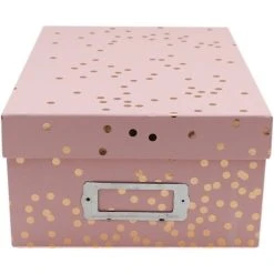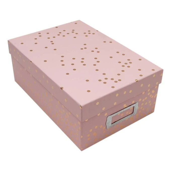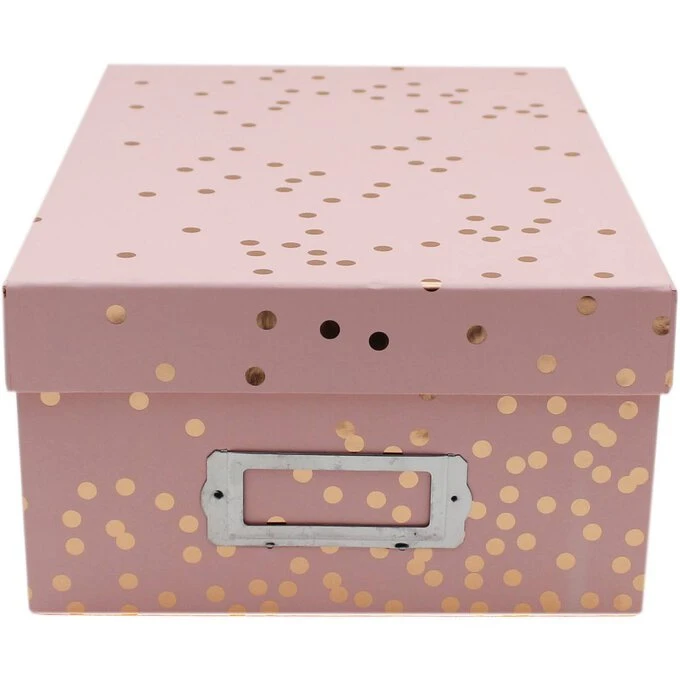 Store photos with ease and add vibrant pattern to your home with this Rose Gold Dot Storage Box!