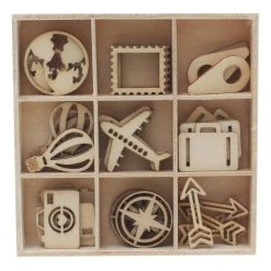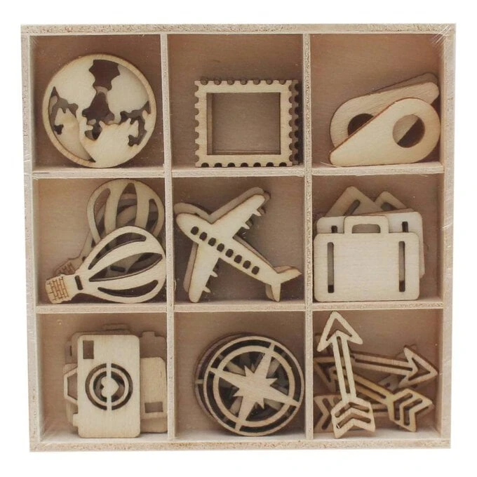 Travel Wooden Embellishments are perfect for adding unique details to your travel journals and scrapbooks! Featuring nine travel-inspired designs, these wooden shapes will instantly and effortlessly add extra dimension to any of your designs โ perfect for your papercrafts.