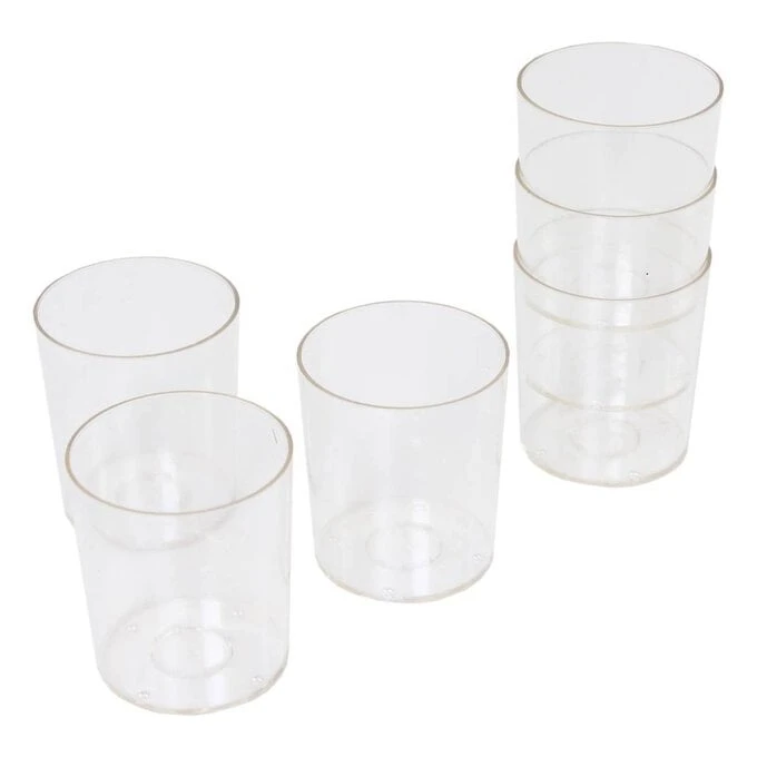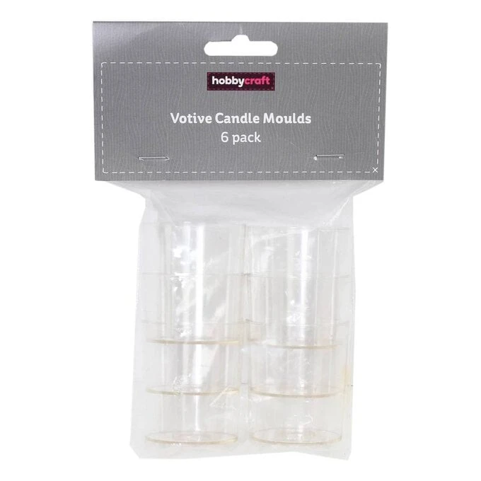 This pack includes six polycarbonate moulds for making votive candles. Use our natural or paraffin pillar blend wax for these moulds and the small candle wicks. Each candle will require approximately 65g of wax. When pouring in your melted wax, ensure that the hot wax does not exceed 120 degrees Celsius so as not to distort the mould.