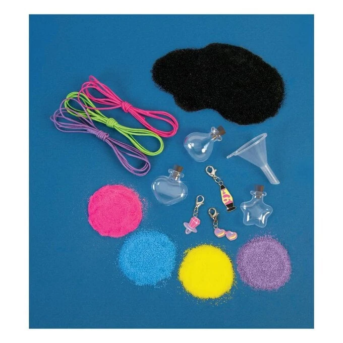 The set comes complete with everything needed to create your sand art accessories, and they’ll be fun to make and even more fun to wear. You’ll have three colours of waxed cotton cords (3m), three plastic bottles, mini funnel, black sand (10g), four colours of glow-in-the-dark sand (40g), three charms and instructions.