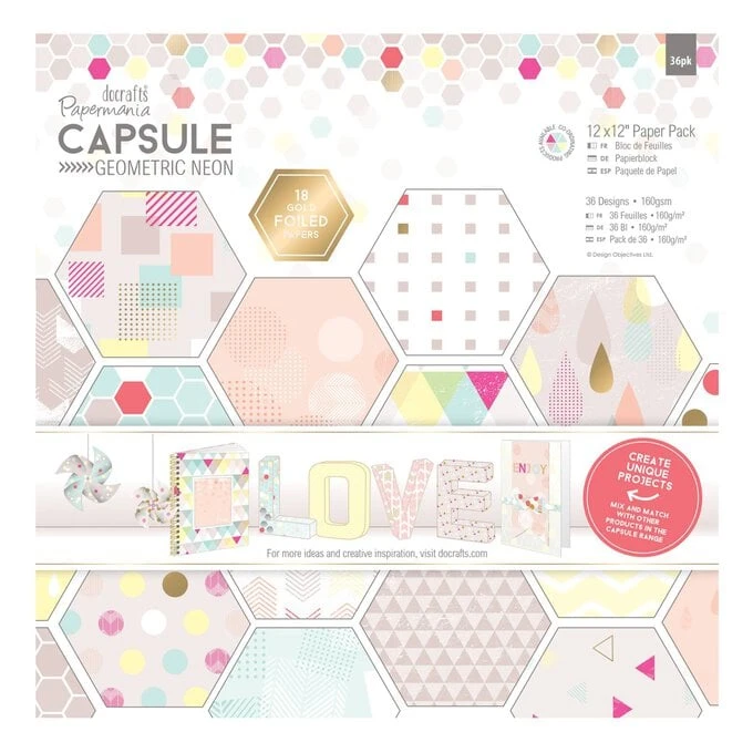 The paper pad is full of geometric icons and patterns, accented with neon and foil finishes for a wonderful wow factor. There are 36 individual designs, 18 of which feature gold foil details.