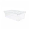 The storage box features a white press-to-lock lid, designed to keep the items safe. The box has a transparent base with a lattice design for reinforcement.